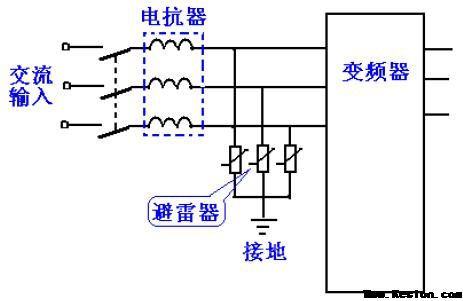 雷击分为直击雷和感应雷。直击雷是雷电直接落在雷击物上,产生的破坏最大;感应雷是雷电产生的电磁波在导体上产生的感应高压,使连接到导体上的电器过压而损坏。在电网上,已经安装了多级避雷器,但前级雷电的残存电压或变频器附近的雷电感应电压仍然会对变频器造成破坏。